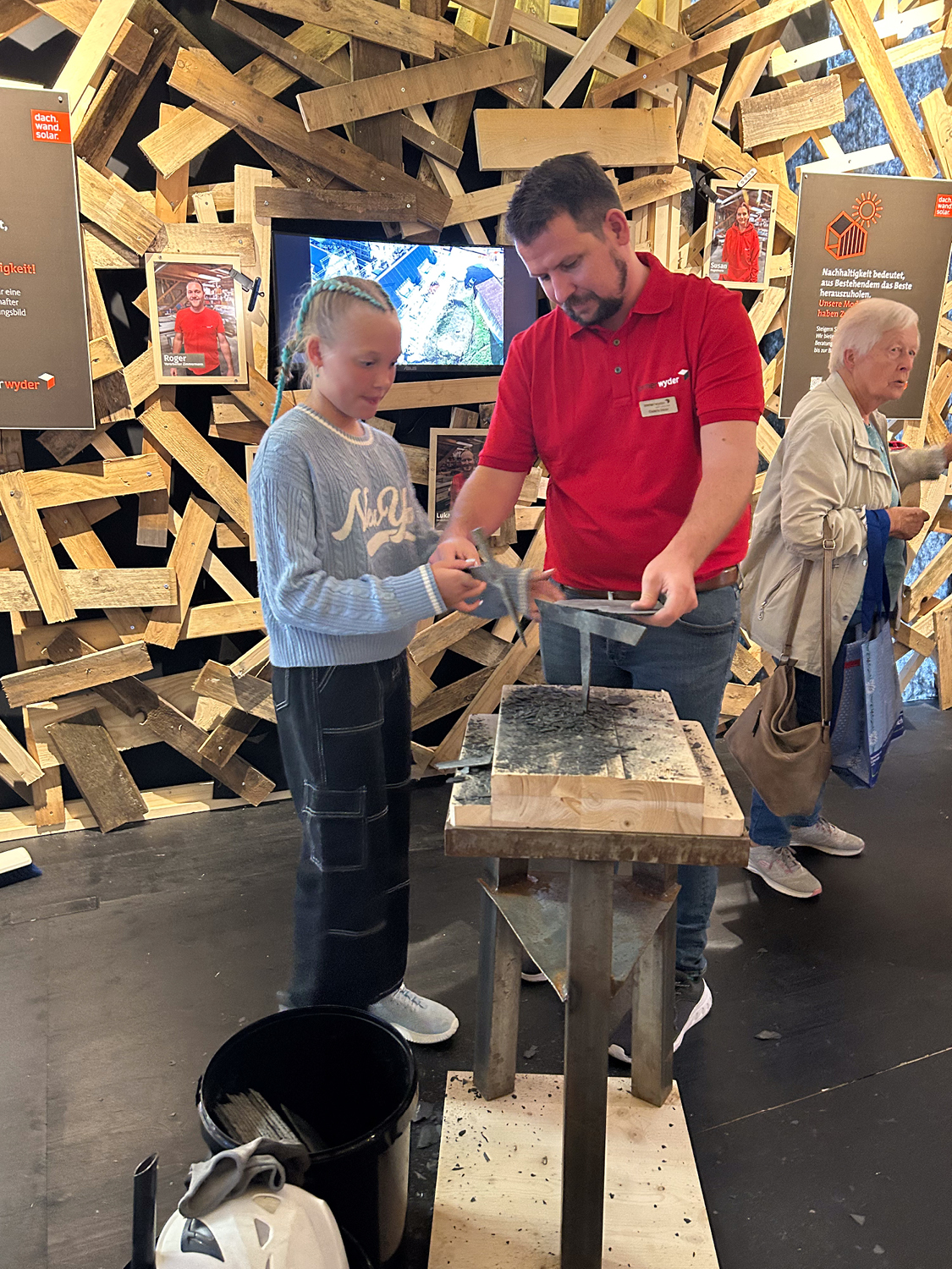 Am letzten Messetag herrschte in der Halle reger Betrieb – das wechselhafte Wetter trieb viele Besucherinnen und Besucher nach drinnen, wo wir sie an unserem Stand empfingen. Besonders beliebt war unsere Mitmachstation, an der man selbst Herzen aus Naturschiefer schneiden konnte. Das kam bei Gross und Klein gut an: Während die Kinder konzentriert werkelten, nutzten die Eltern die Zeit für Gespräche und einen Blick auf unsere Arbeiten, wenn sie nicht gerade damit beschäftigt waren fleissig mitzuhelfen.